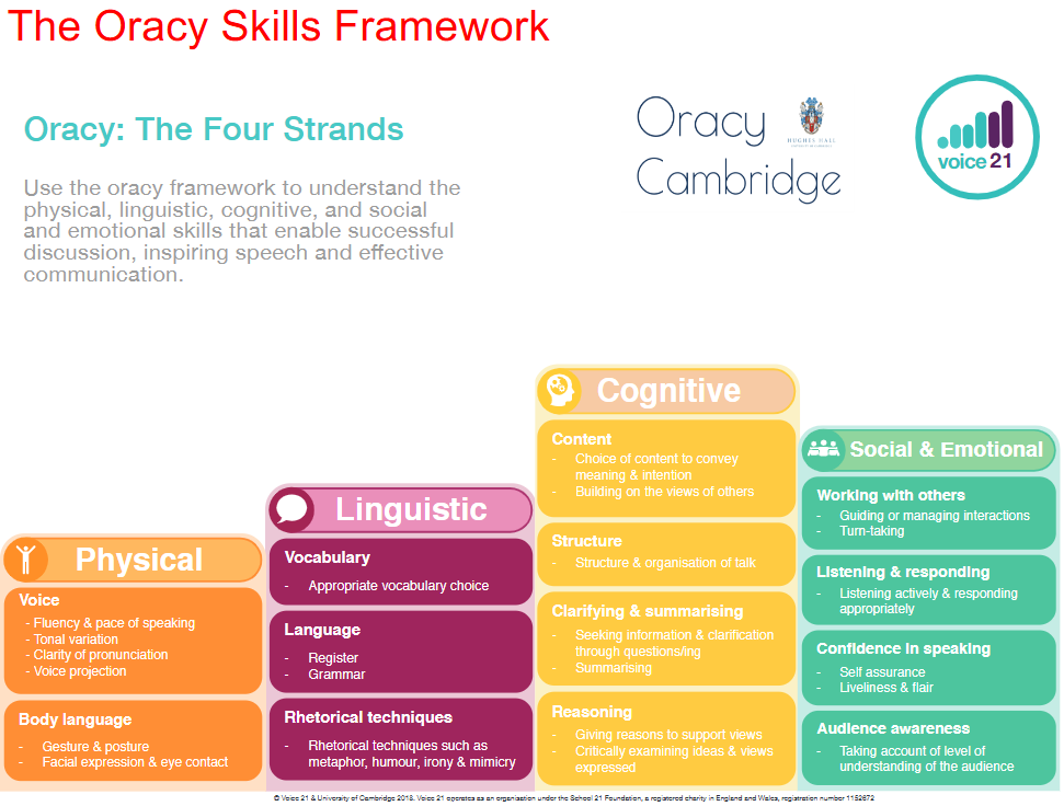 - The school will provide ongoing training and coaching on oracy, dialogic teaching and the Cambridge Oracy Skills Framework.